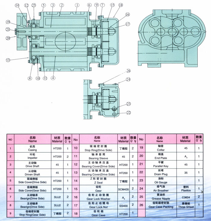 三葉羅茨風(fēng)機(jī)主要用作排氣的機(jī)械設(shè)備,三葉羅茨鼓風(fēng)機(jī)的優(yōu)點(diǎn)是,在中心距離和外圓半徑相同的情況下,弧葉型三葉轉(zhuǎn)子羅茨鼓風(fēng)機(jī)比兩葉的位移大。漸開線葉型羅茨鼓風(fēng)機(jī)的位移與轉(zhuǎn)子的頭數(shù)無關(guān)。三葉轉(zhuǎn)子羅茨鼓風(fēng)機(jī)的振動和噪音比二葉小,三葉轉(zhuǎn)子使用的軸承壽命比二葉使用的長約15%。另外,三葉轉(zhuǎn)子可以使用扭轉(zhuǎn)轉(zhuǎn)子來減少噪音和振動,二葉轉(zhuǎn)子由于結(jié)構(gòu)限制,不能使用扭轉(zhuǎn)葉片結(jié)構(gòu)。三葉轉(zhuǎn)子的力學(xué)性能比較好,比二葉更能保證葉輪之間和葉輪與外殼之間的間隙。三葉轉(zhuǎn)子羅茨鼓風(fēng)機(jī),特別是扭曲的葉型,噪音和動平衡性能好,在汽車機(jī)械增壓方面的應(yīng)用越來越多。